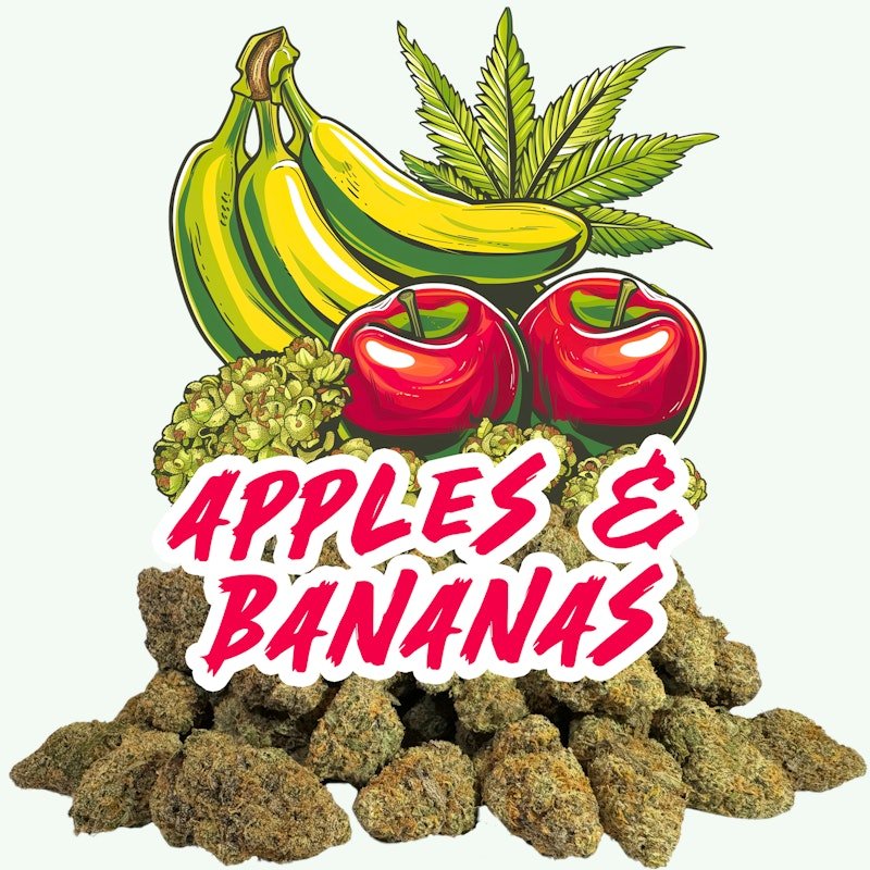 Apples and Bananas is an evenly balanced hybrid strain (50% indica/50% sativa) created through crossing the delicious [(Platinum Cookies X Granddaddy Purple) X Blue Power] X Gelatti strains. When it comes to the flavor of this bud, the name says it all. Apples and Bananas packs a sweet and fruity taste that’s filled with delicious sugary bananas and sharply sour apples, with a touch of black pepper to it, too. The aroma takes a spicier turn, with sharp punches of savory diesel and sweet chemicals added in. The Apples and Bananas high is just as delicious, with full-bodied effects that will hit you hard and leave you dazed. You’ll feel the heady effects almost immediately, lifting your mind into a state of happy euphoria that’s accompanied by a boost of creativity. As you find your mind wandering through artistic ideas and visions, a deeply relaxing tingle will begin to work its way throughout your entire body. This buzzing effect can turn stimulating and arousing at times, too. These effects combined with its super high 32.1% average THC level and 2% CBD level make Apples and Bananas a great choice for treating chronic pain, depression, chronic stress, appetite loss or nausea and muscle spasms or cramps. This bud has grape-shaped fluffy forest green nugs with deep purple leaves, matching undertones and thin orange hairs.